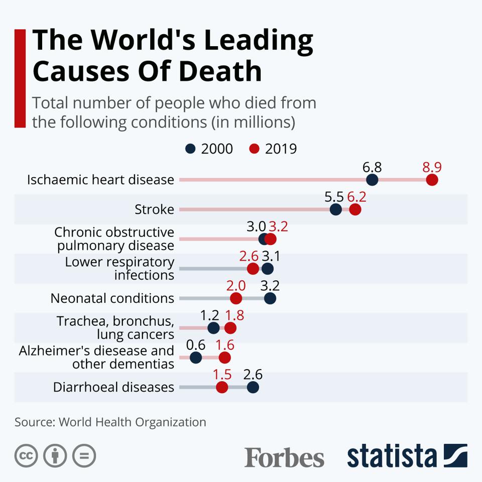 Ischaemic heart disease was the top cause of death in both 2000 and 2019. Globally deaths from TB have reduced by 30. CLRD still remains the fifth leading cause of death in Malaysia are mainly due to lack of proper management and education on such diseases.